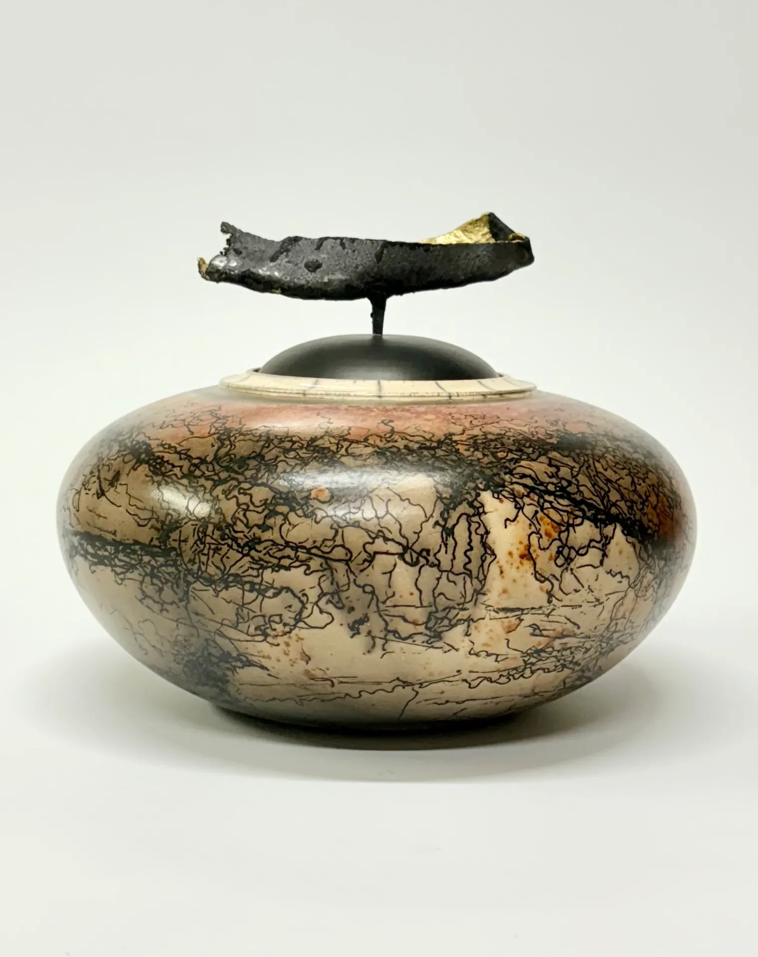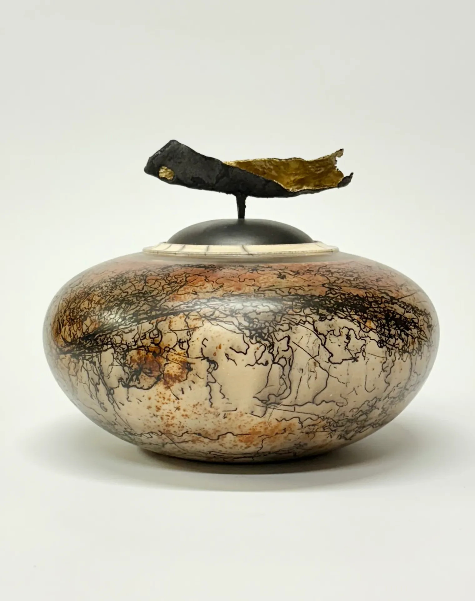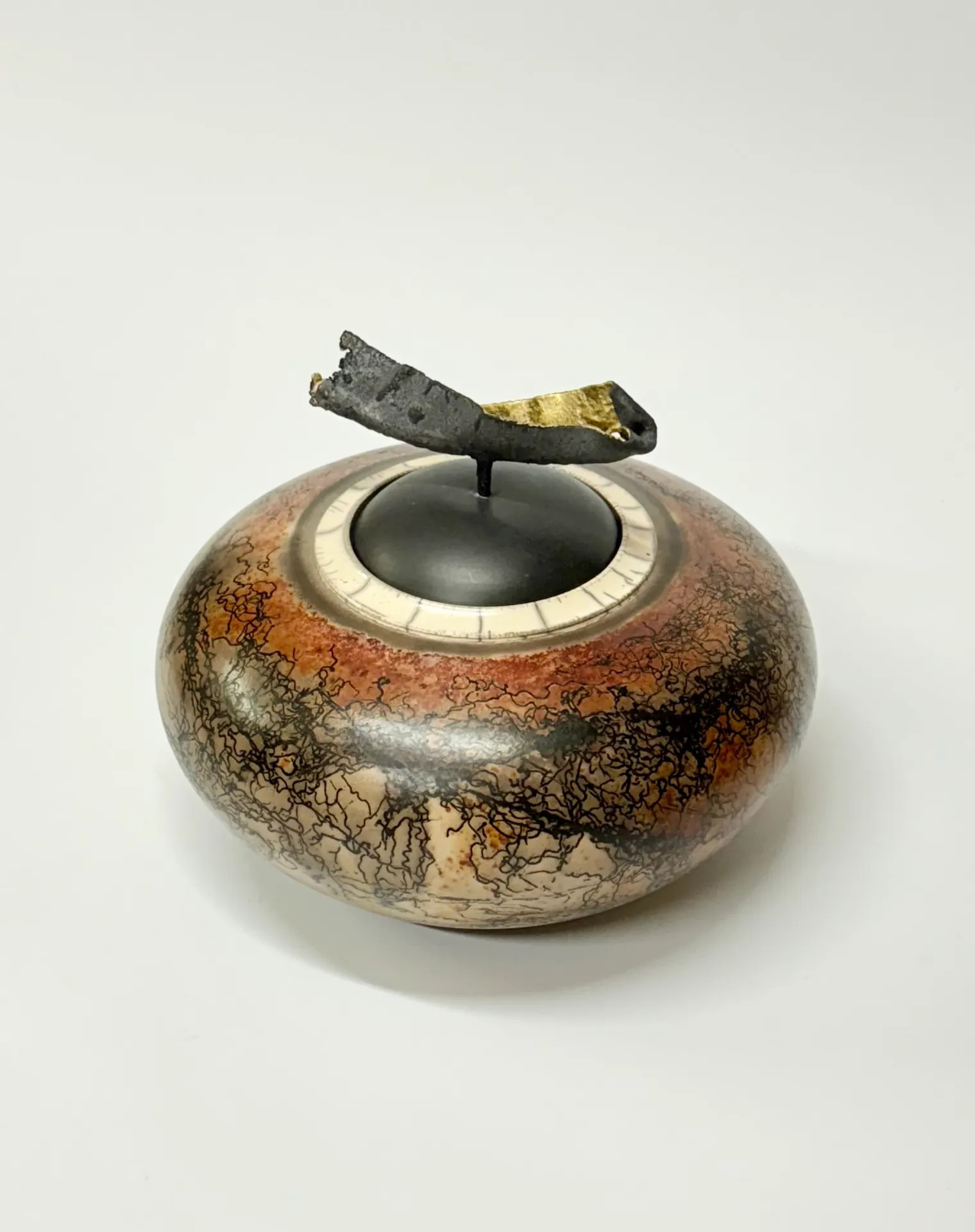 Keramická dóza pálená technikou Raku horsehair. Zdobeno koňskými žíněmi a doplněno červenou barvou – železem. Vnitřek dózy je opatřen průhlednou glazurou. Dóza je doplněná železnou ozdobou, která slouží i jako úchytka při otevírání dózy.
