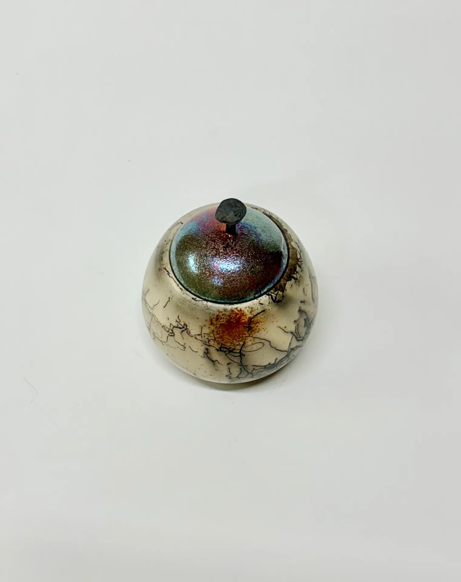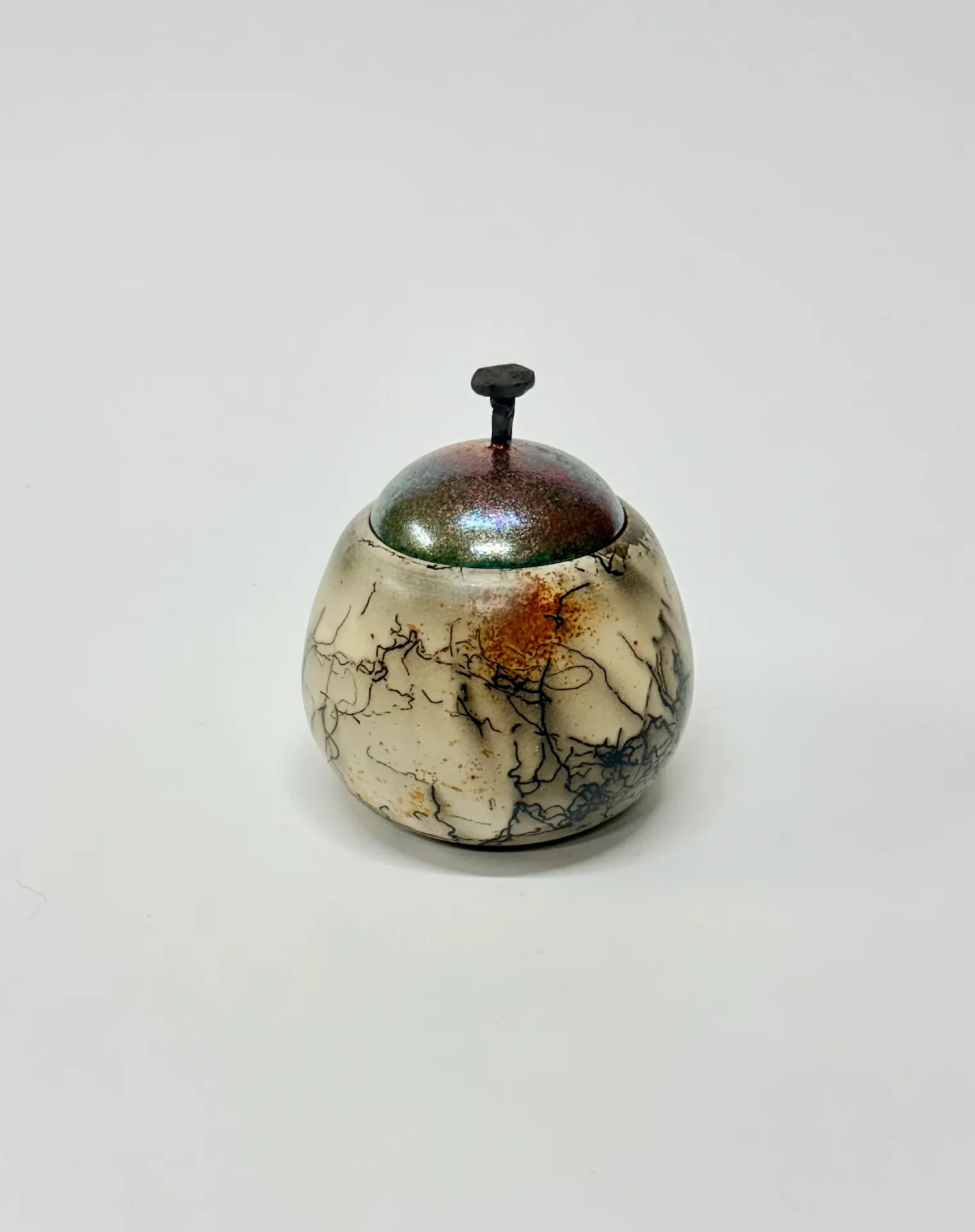 Keramická dózička s kovanou dekorací - kovaný hřebík. Pálená technikou Raku horsehair. Zdobeno koňskými žíněmi a doplněno červenou barvou – železem. Vnitřek dózičky je opatřen průhlednou glazurou.