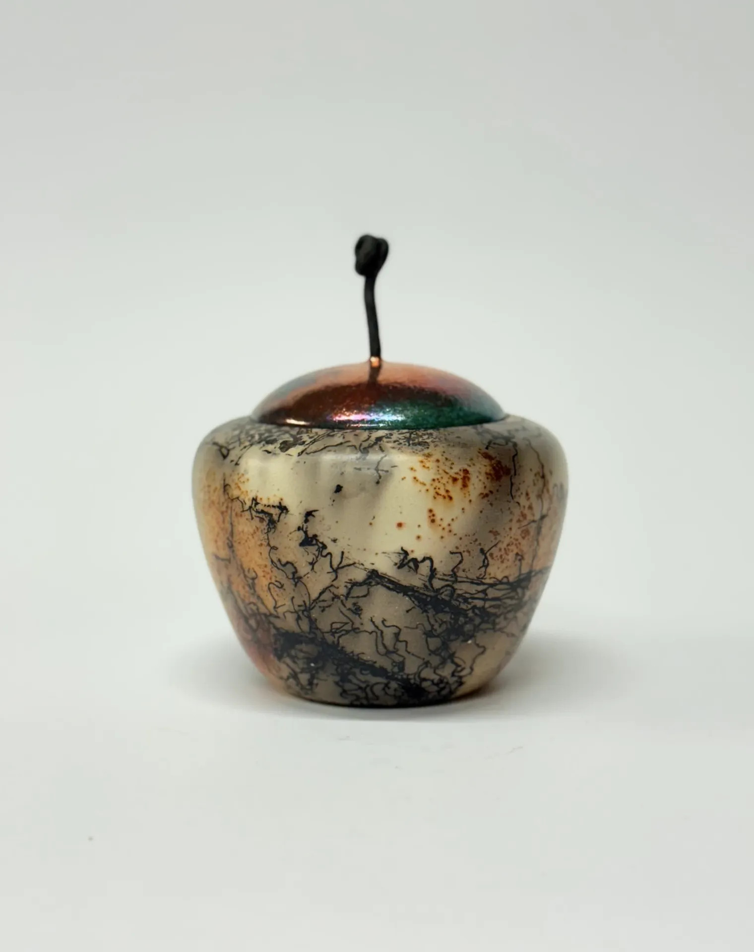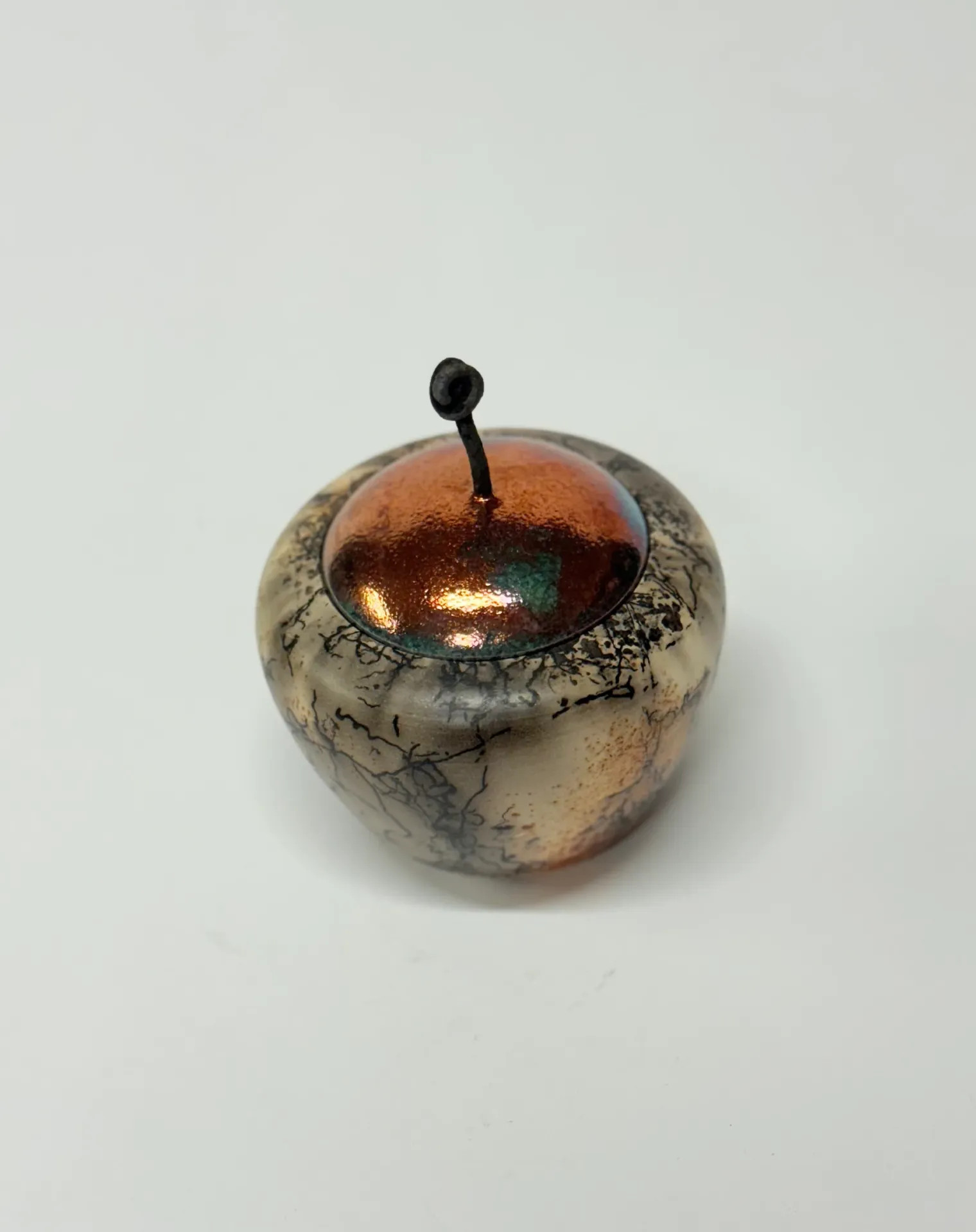 Keramická dózička s kovanou dekorací - kovaný smotek. Pálená technikou Raku horsehair. Zdobeno koňskými žíněmi a doplněno červenou barvou – železem. Vnitřek dózičky je opatřen průhlednou glazurou.