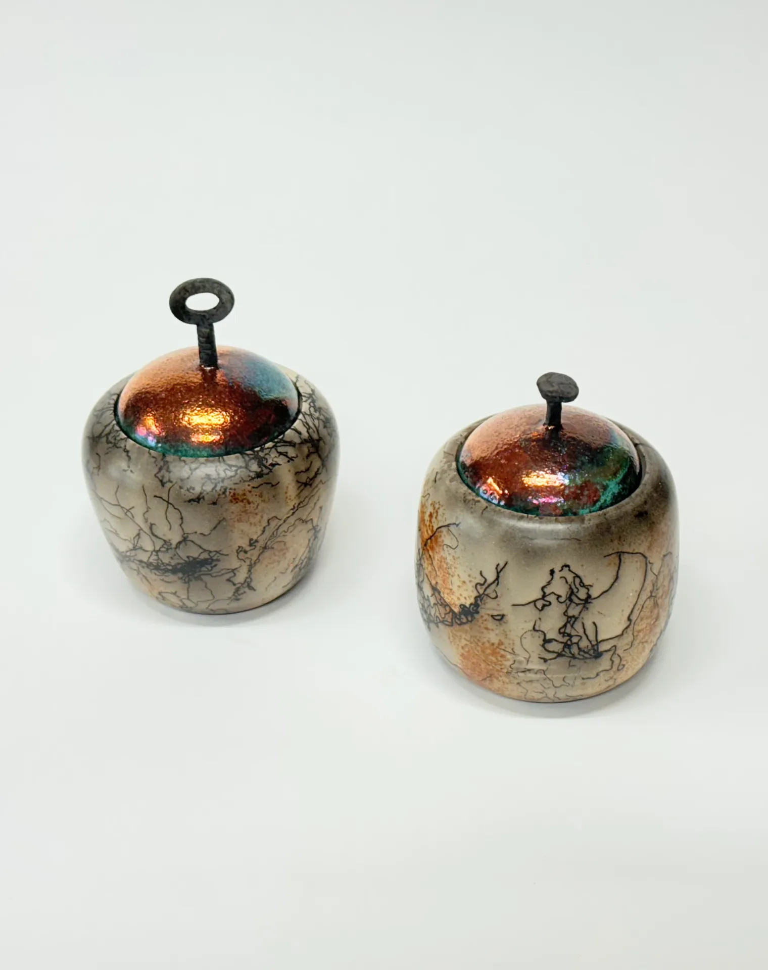 Keramická dózička s kovanou dekorací. Pálená technikou Raku horsehair. Zdobeno koňskými žíněmi a doplněno červenou barvou – železem. Vnitřek dózičky je opatřen průhlednou glazurou. Na víčku je patrná měděná barva, ta je způsobena větší redukcí.