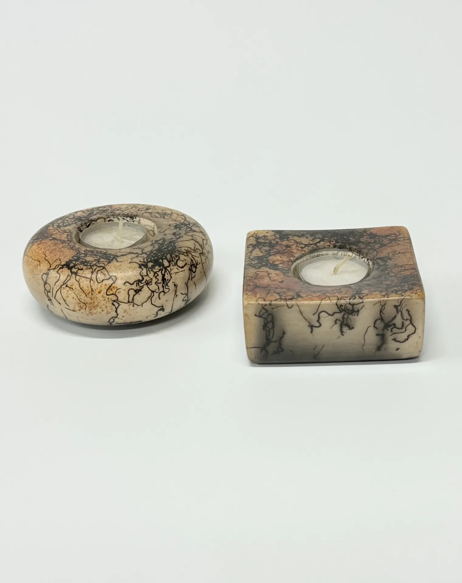 Keramický svícen. Pálený technikou Raku horsehair. Zdobeno koňskými žíněmi a doplněno červenou barvou – železem.