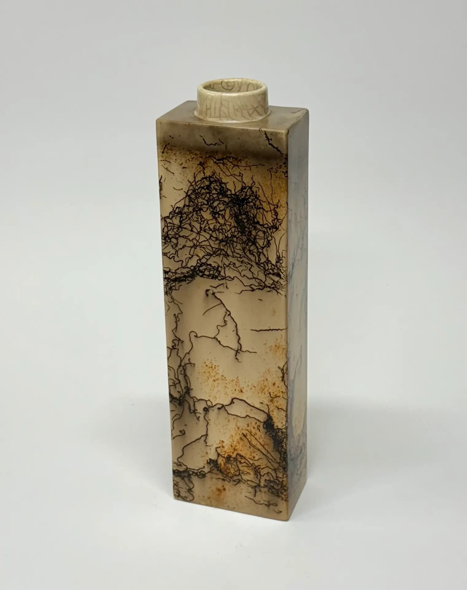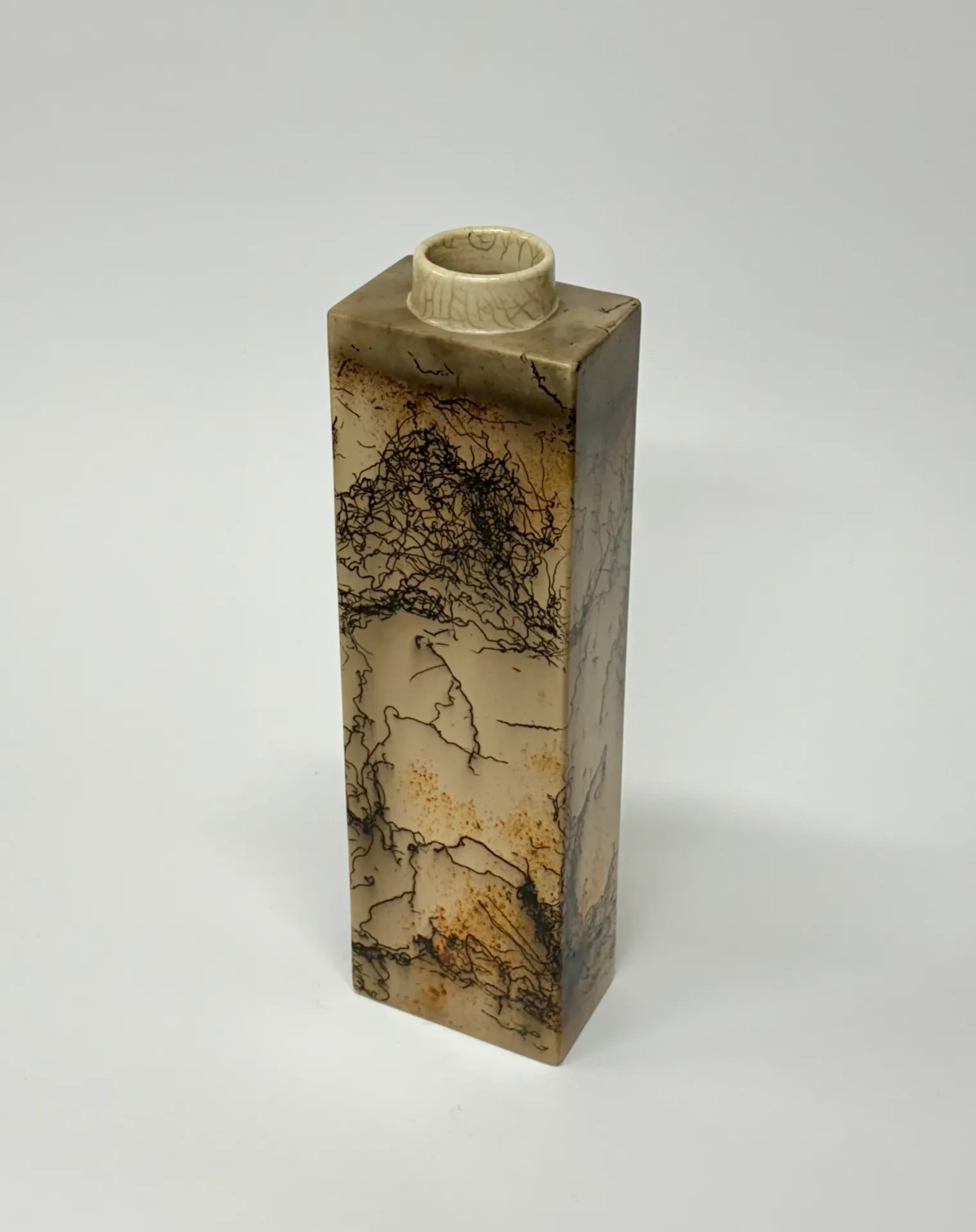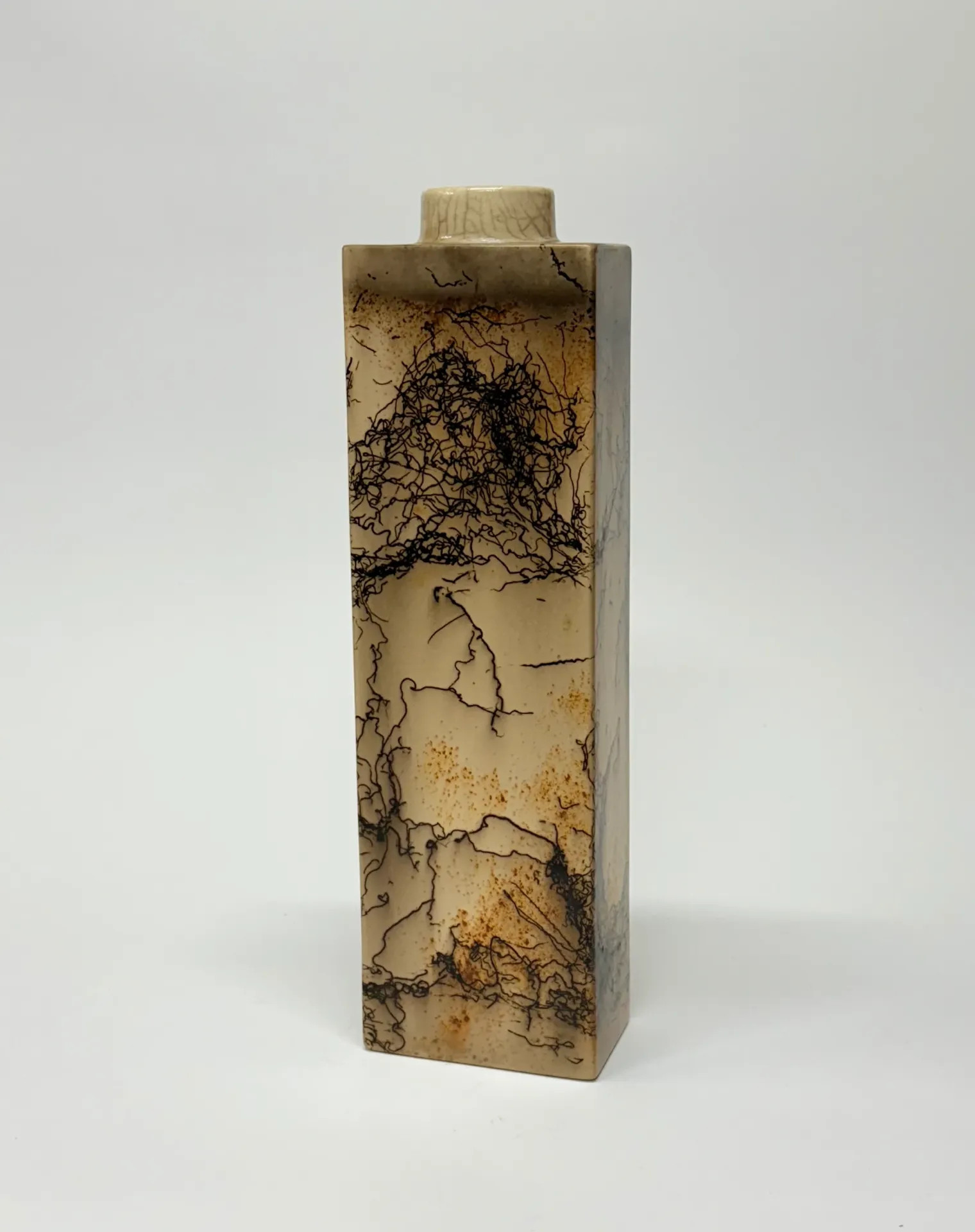 Keramická váza pálená technikou Raku horsehair. Zdobeno koňskými žíněmi a doplněno červenou barvou – železem. Vnitřek vázy je opatřen průhlednou glazurou.