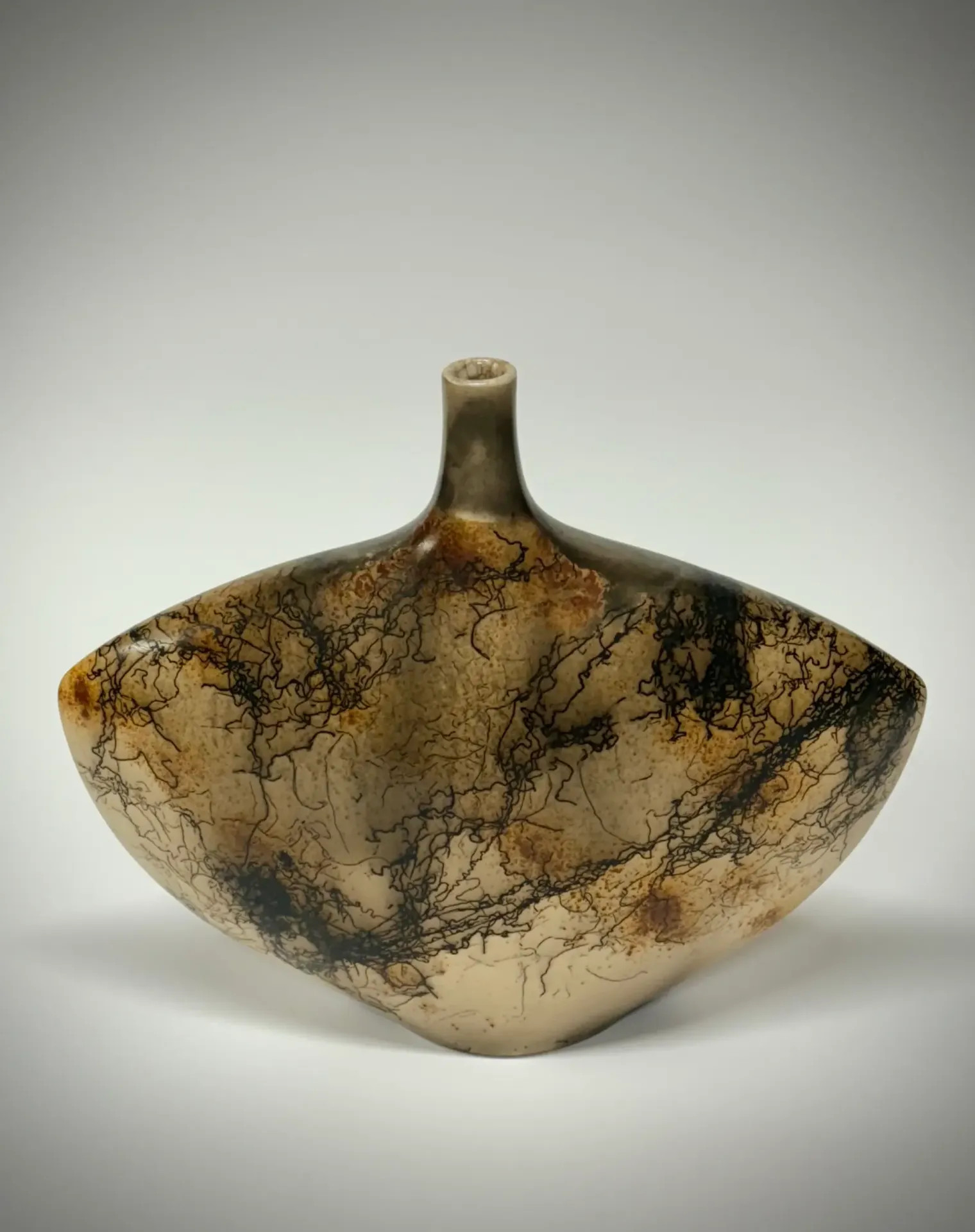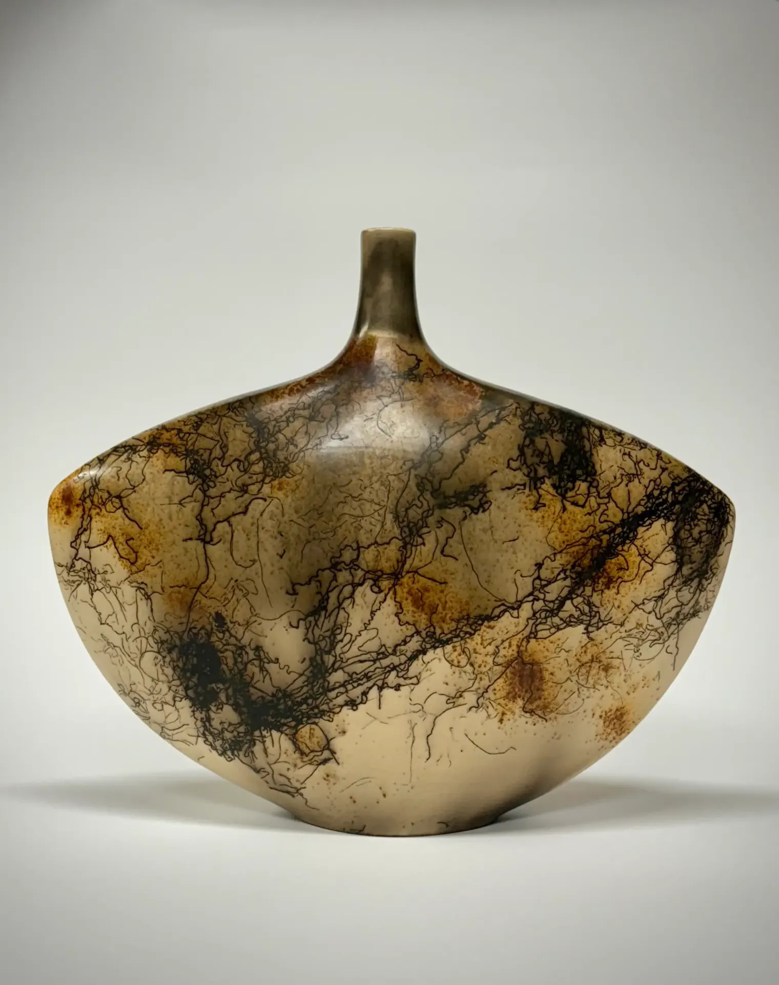 Keramická váza pálená technikou Raku horsehair. Zdobeno koňskými žíněmi a doplněno červenou barvou – železem. Vnitřek vázy je opatřen průhlednou glazurou.