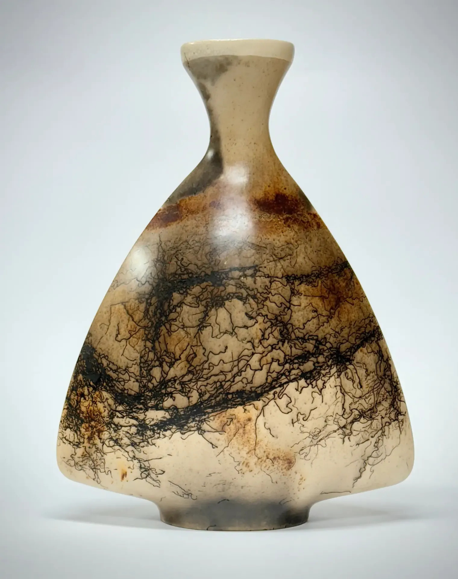 Keramická váza pálená technikou Raku horsehair. Zdobeno koňskými žíněmi a doplněno červenou barvou – železem. Vnitřek vázy je opatřen průhlednou glazurou.