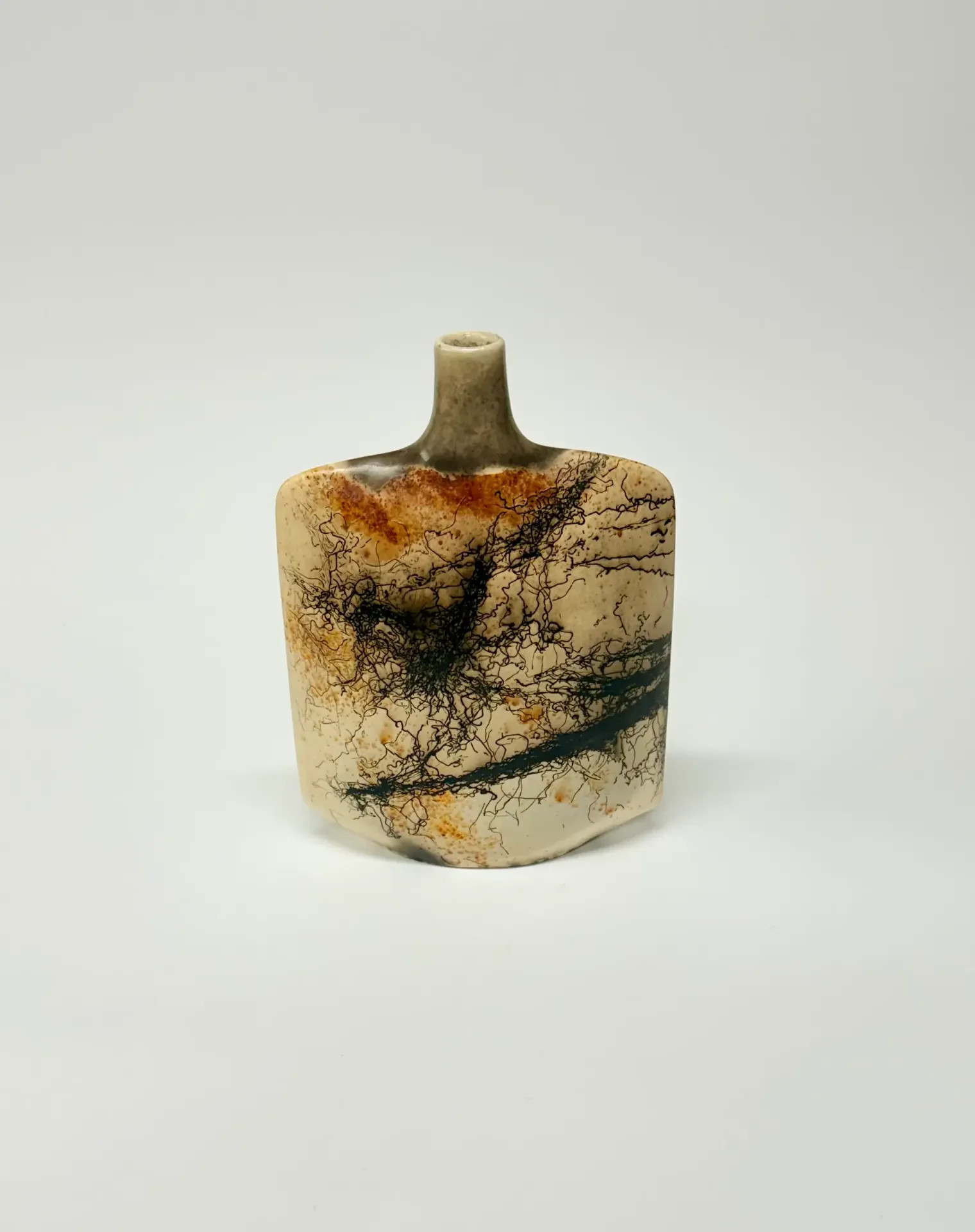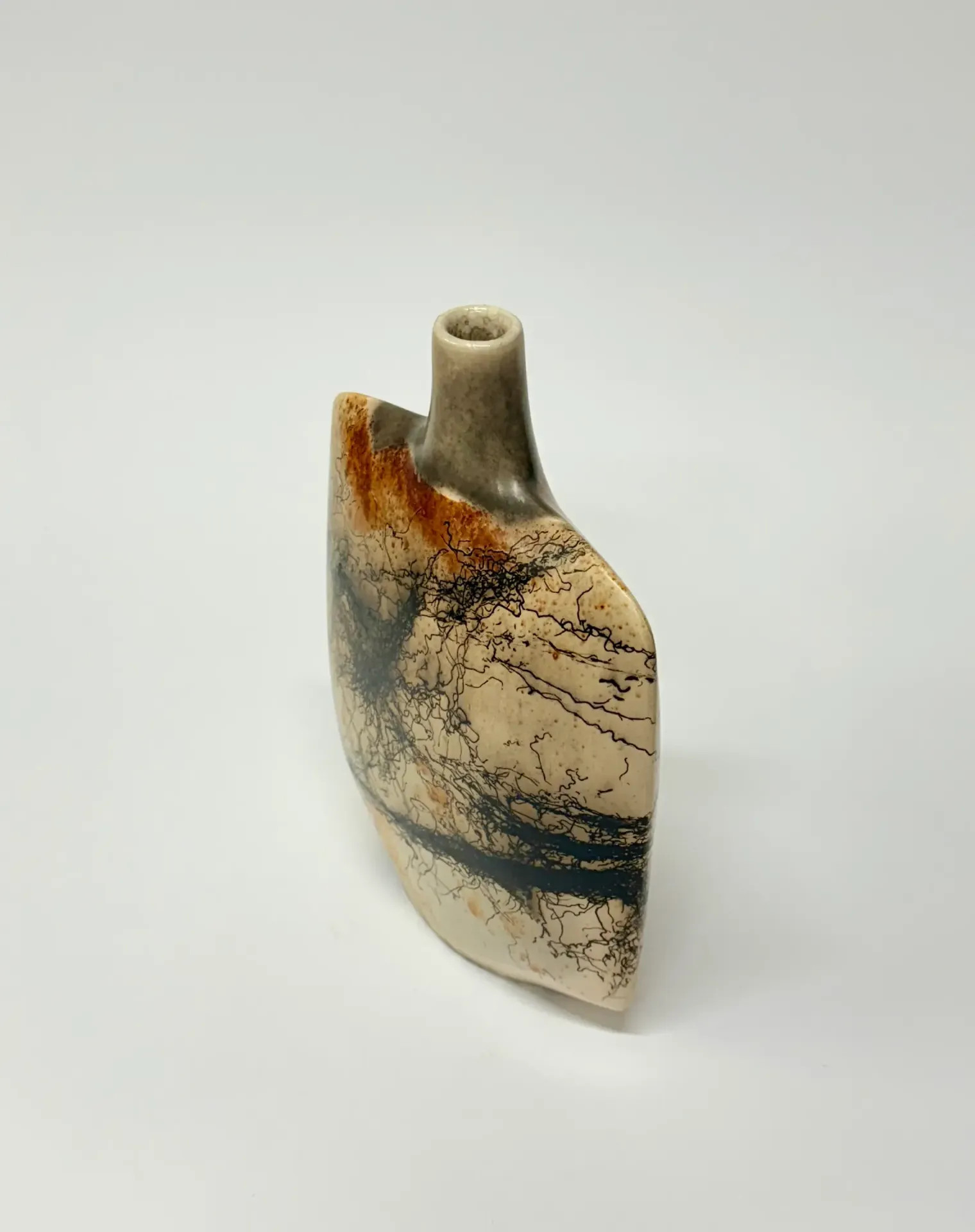 Keramická váza pálená technikou Raku horsehair. Zdobeno koňskými žíněmi a doplněno červenou barvou – železem. Vnitřek vázy je opatřen průhlednou glazurou.