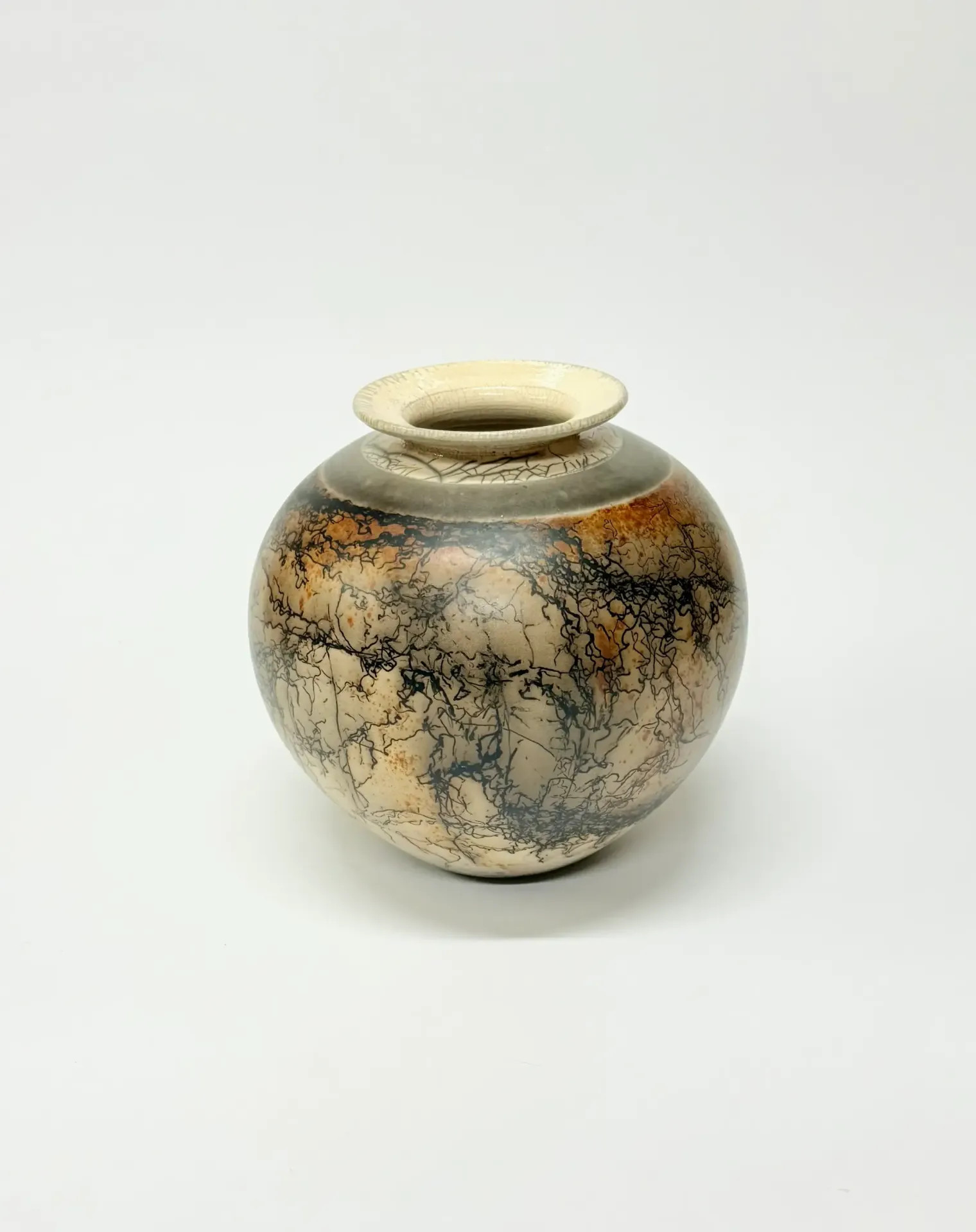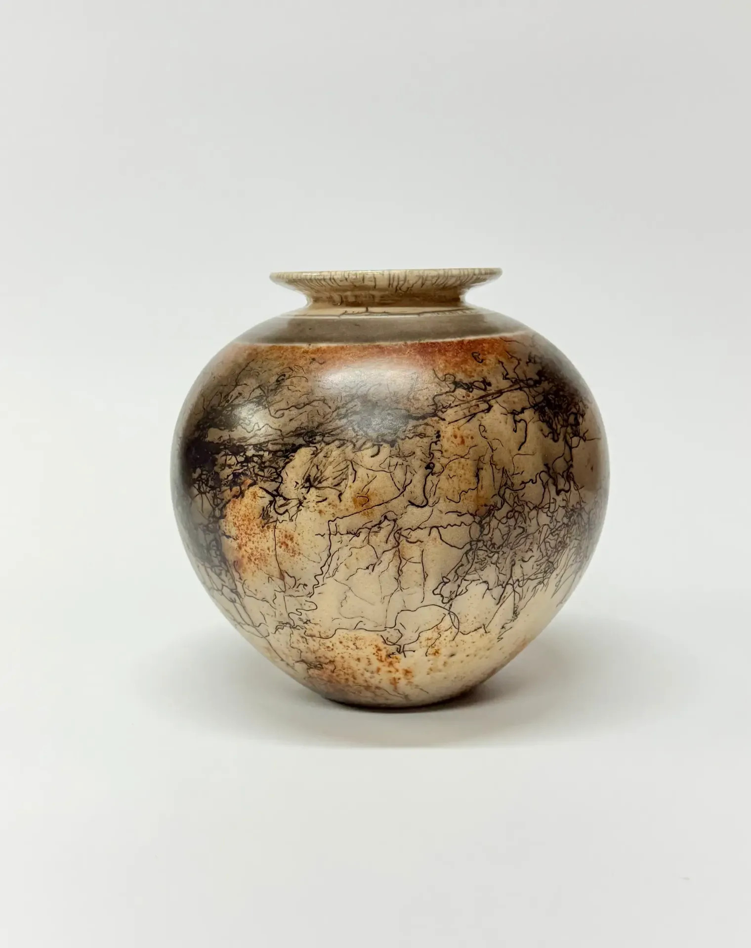 Keramická váza pálená technikou Raku horsehair. Zdobeno koňskými žíněmi a doplněno červenou barvou – železem. Vnitřek vázy je opatřen průhlednou glazurou.