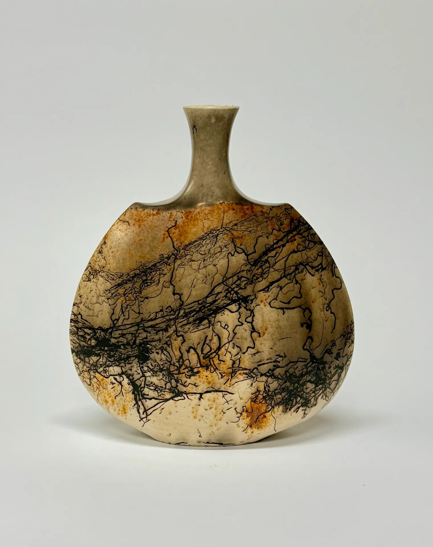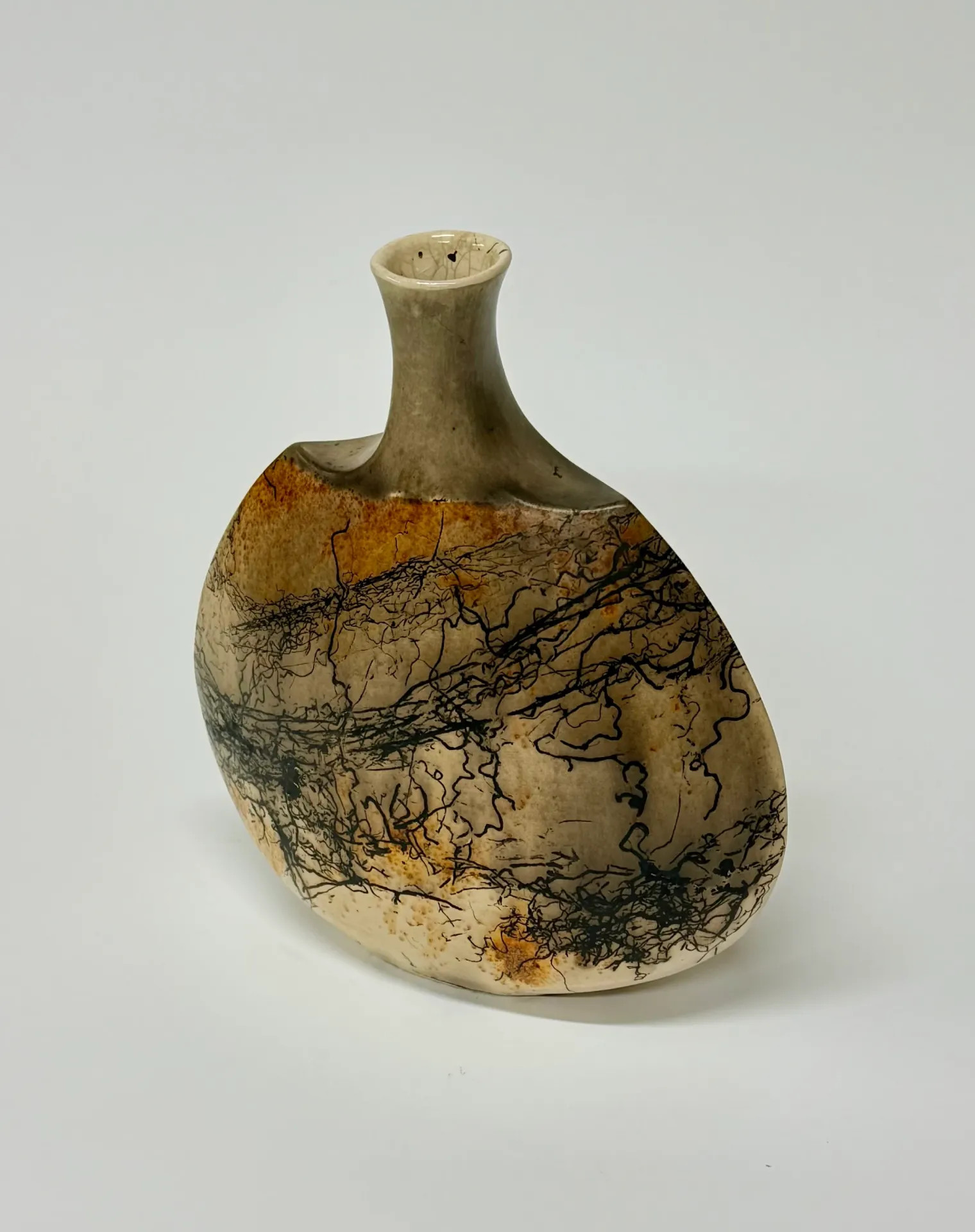 Keramická váza pálená technikou Raku horsehair. Zdobeno koňskými žíněmi a doplněno červenou barvou – železem. Vnitřek vázy je opatřen průhlednou glazurou.