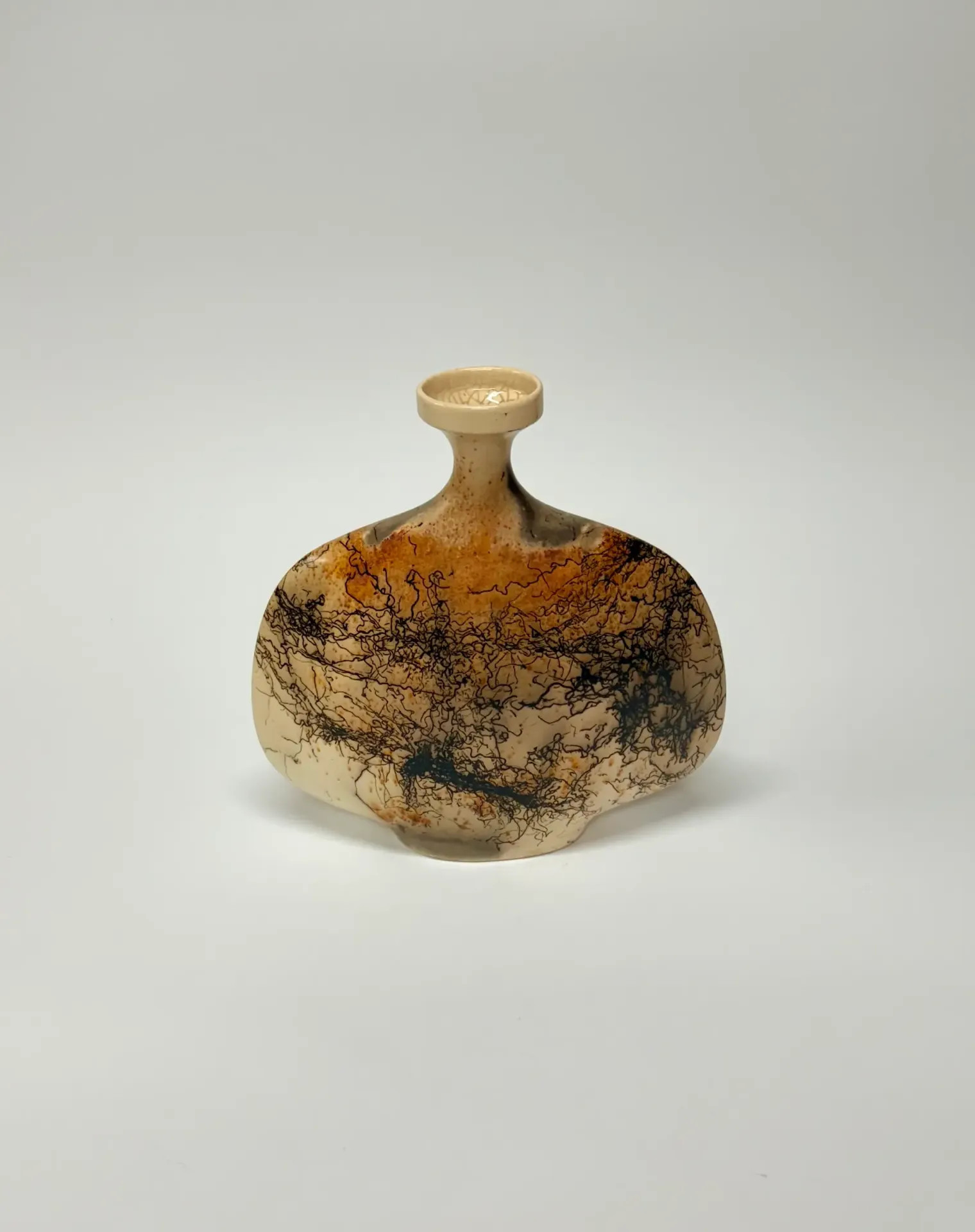 Keramická váza pálená technikou Raku horsehair. Zdobeno koňskými žíněmi a doplněno červenou barvou – železem. Vnitřek vázy je opatřen průhlednou glazurou.